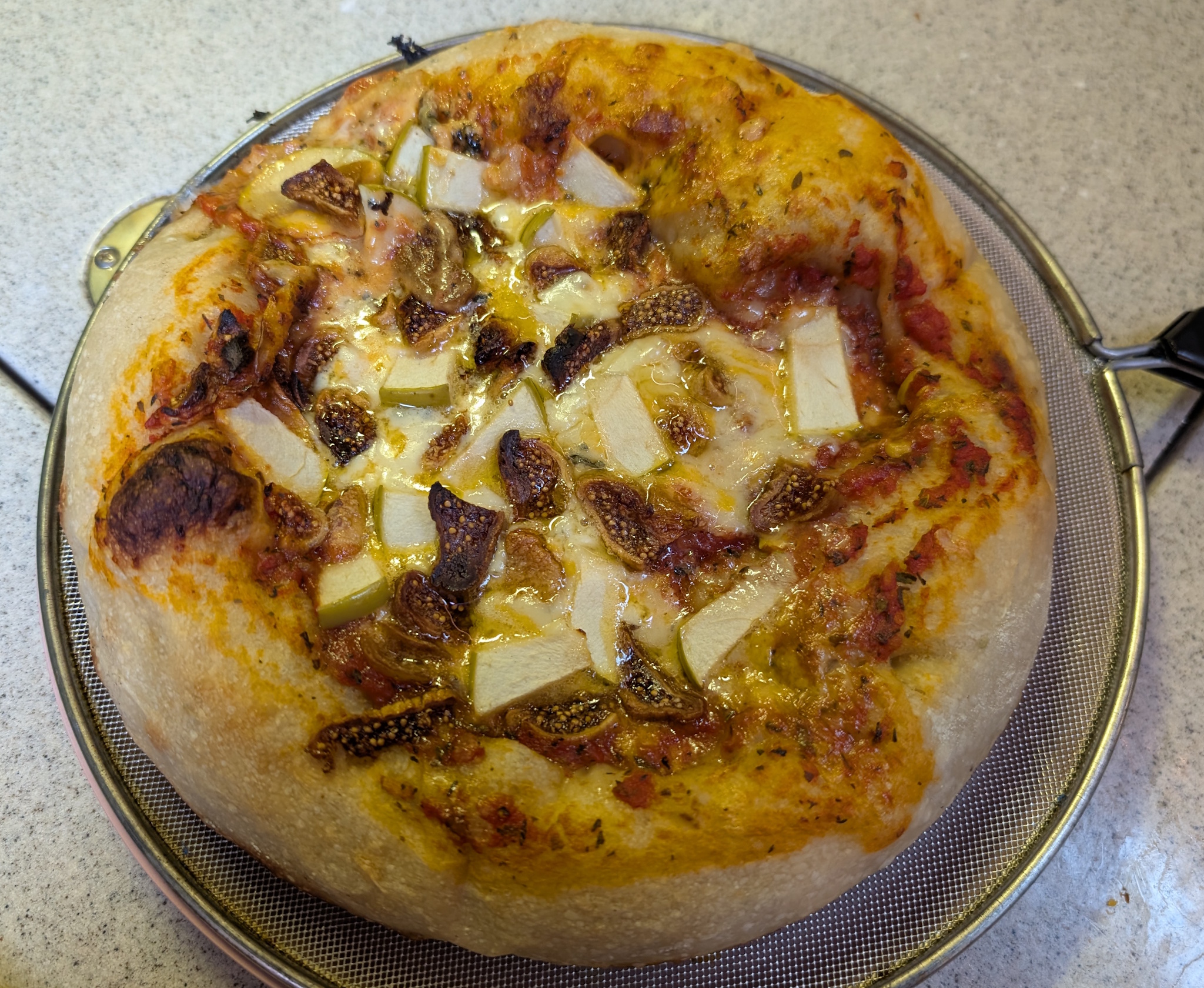 Less rainy, but just as gray, our activities on Tuesday weren’t much different: the last piece of overnight-risen dough from the previous day became a pizza, fig & apple with blue cheese (and gruyere and cheddar–we’re running low on cheese options now). Delicious.