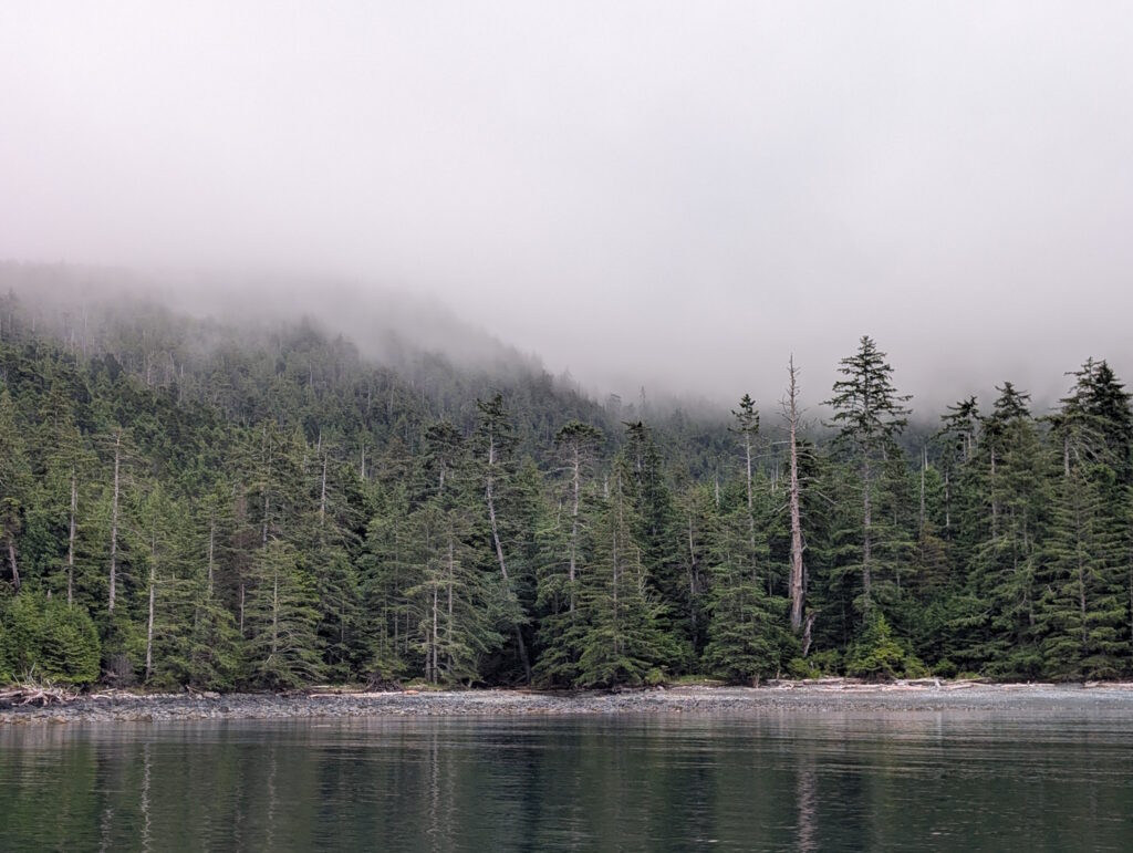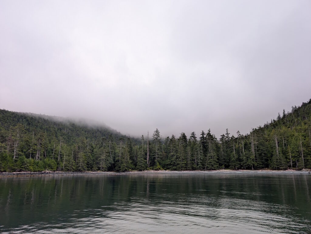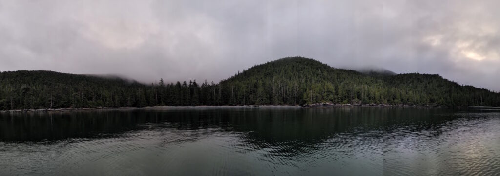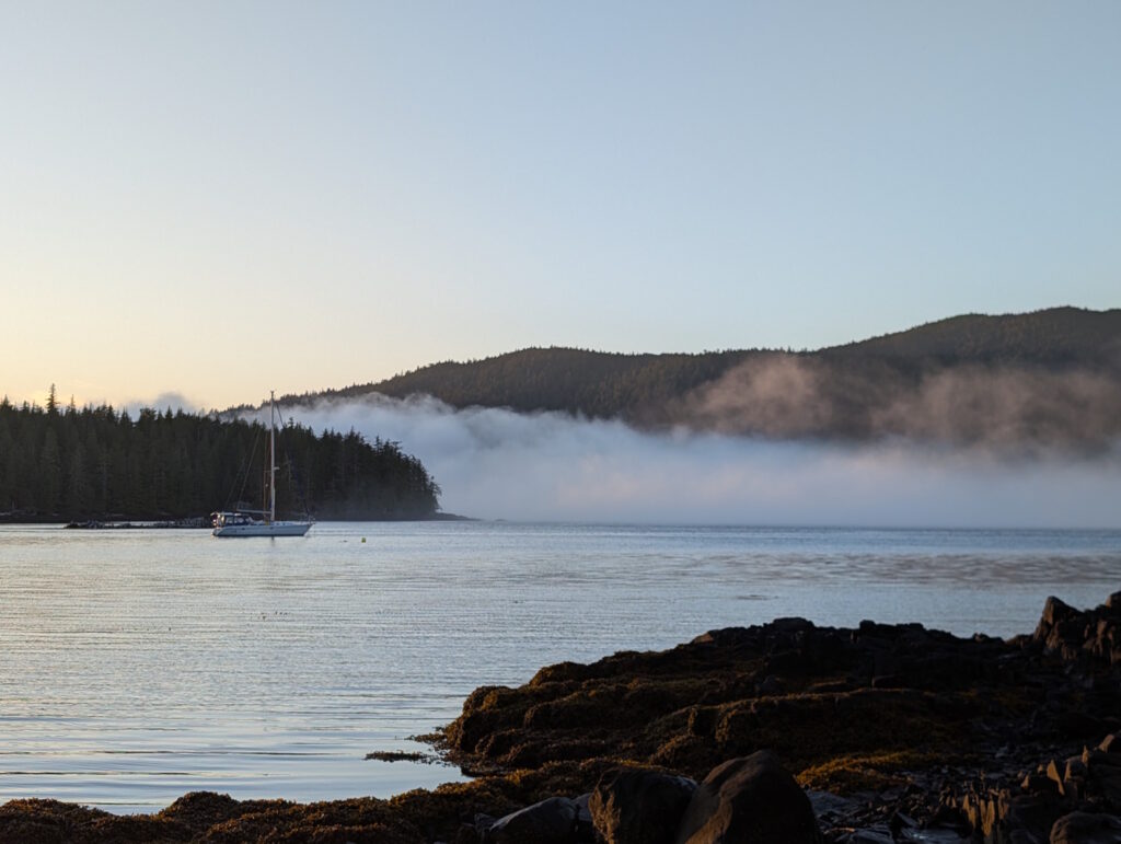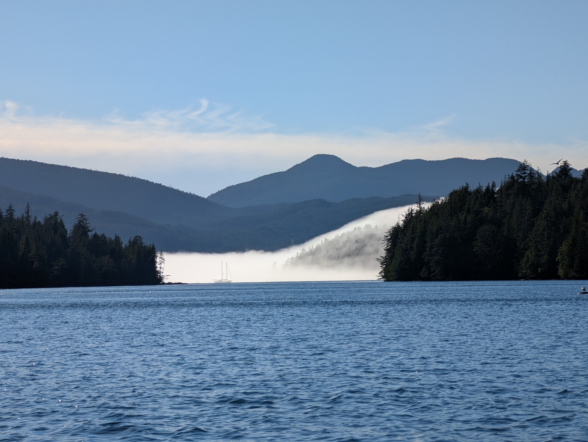 We had dinner reservations made via our satellite email address with Rose Harbour Kitchen for Wednesday evening, alongside a tour group from Moresby Explorers, so pulled anchor from Keeweenah Bay to head back to Rose Harbour, anchoring in nearly the same spot as before. A beautiful heavy fog was rolling up into Rose Inlet from the south, and the view from the anchorage was stunning!