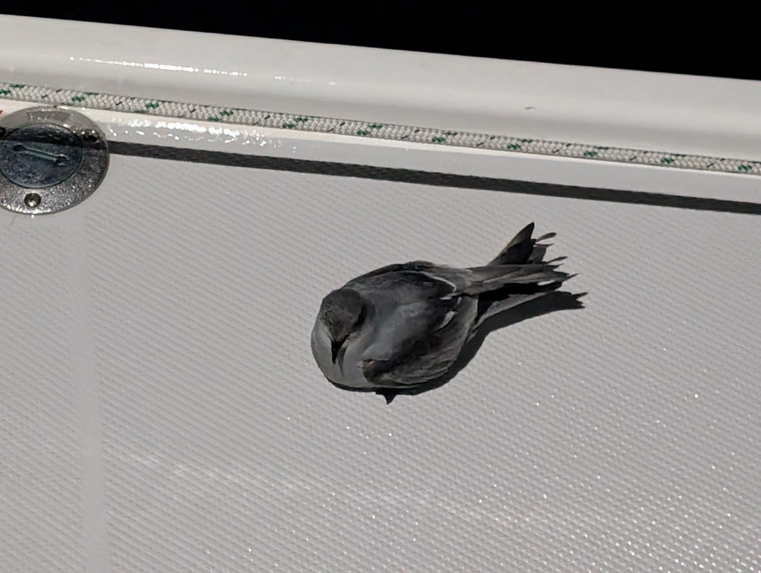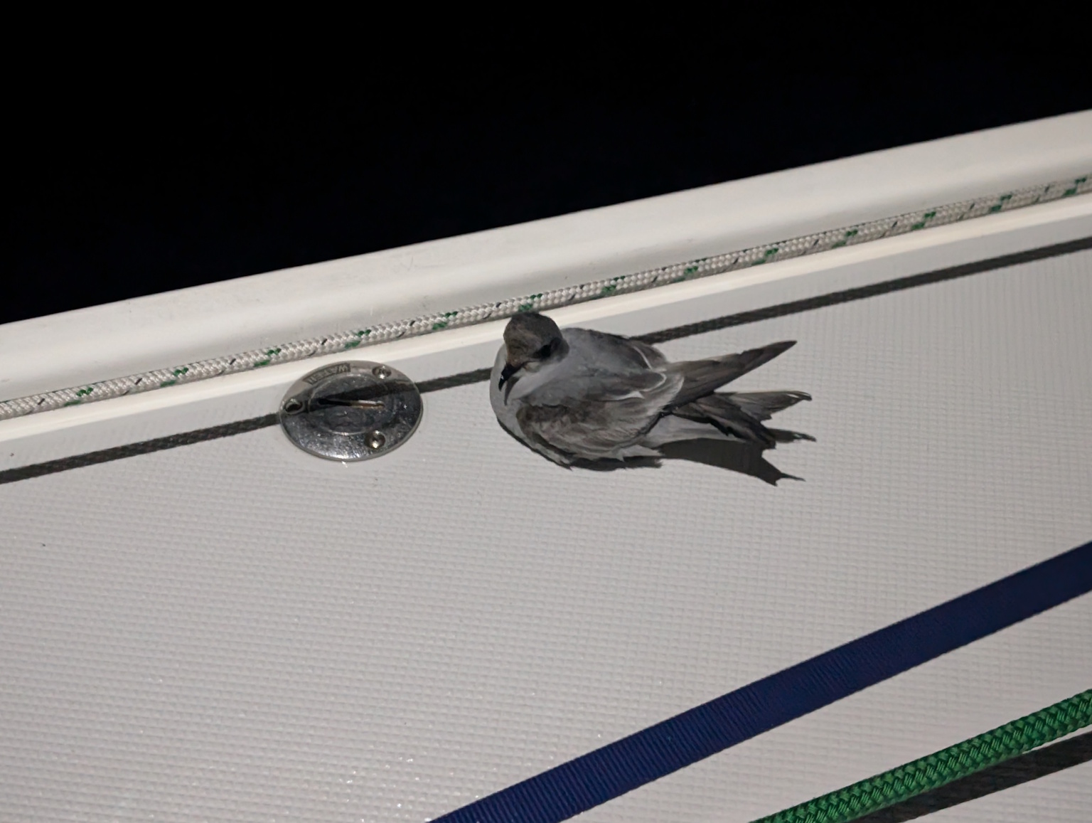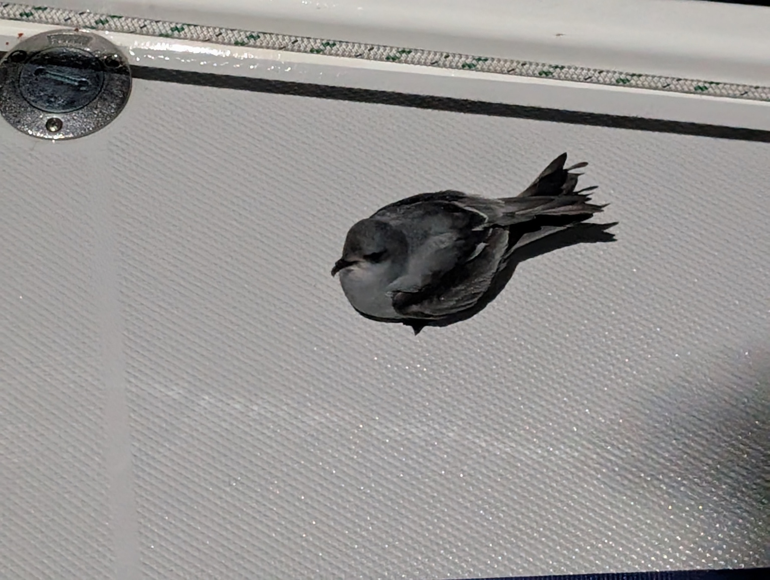Not too long before we started to head back to our anchorage, a group of small storm petrels (it seemed to be a mix of fork-tailed and Leach’s) started swarming around the boat, apparently confused by our navigation and steaming lights. They were doing a mix of flying around the boat, landing on the boat, and crash landing on the boat; a few times I had to gently get one untangled from some lines, but they seemed ok, if confused by the lights. The deck light we needed to have on to anchor didn’t help matters exactly, but once we got all the lights off, after a while we stopped hearing their tittering and the patter of their tiny, webbed feet. I don’t like handling wildlife unless absolutely necessary, but they were incredibly light-weight–a small parrot of a similar size is nearly twice as heavy from what I remember from experience, and they didn’t struggle as I gently helped them get untangled, or in one case, lifted it out of the chain locker it had gotten into. We had to be careful while anchoring not to step on any that were on the deck, some wandering around, others settling down to sit.