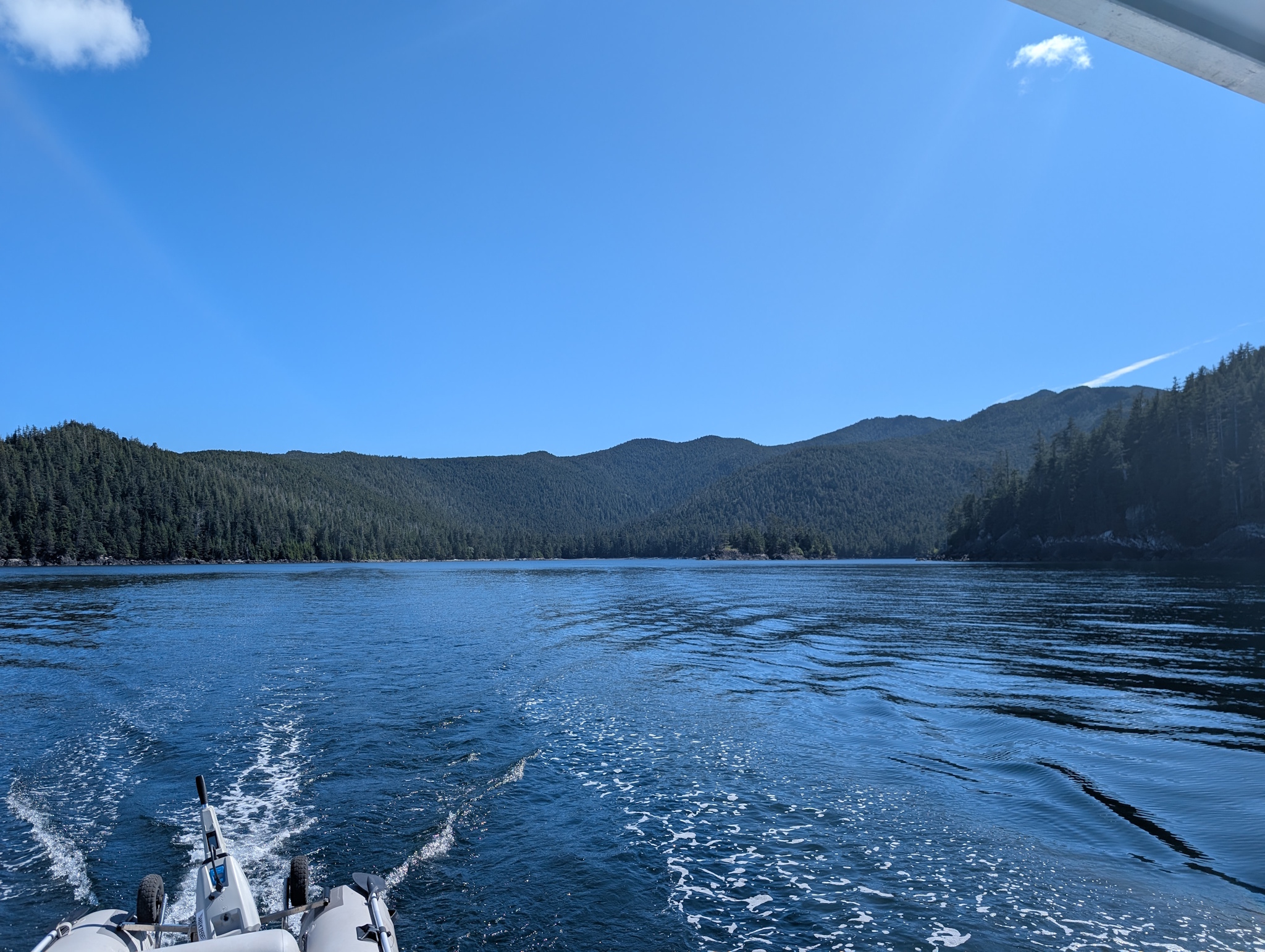 That evening though, we got satellite texts from our shore support contacts that there was a tsunami warning for the area. Tuning into VHF 16 we heard the same from the Canadian Coast Guard station in Prince Rupert. As it was a calm evening, we decided it was better to be safe than very, very sorry, pulled anchor around 8:30pm, and motored out into the calm-but-rolly Hecate Strait about a mile and a half from the nearest shoreline in 300-500 feet of water, deeper even than the at least 180 feet of depth the Coast Guard was recommending boat owners get their boats out to in the area.