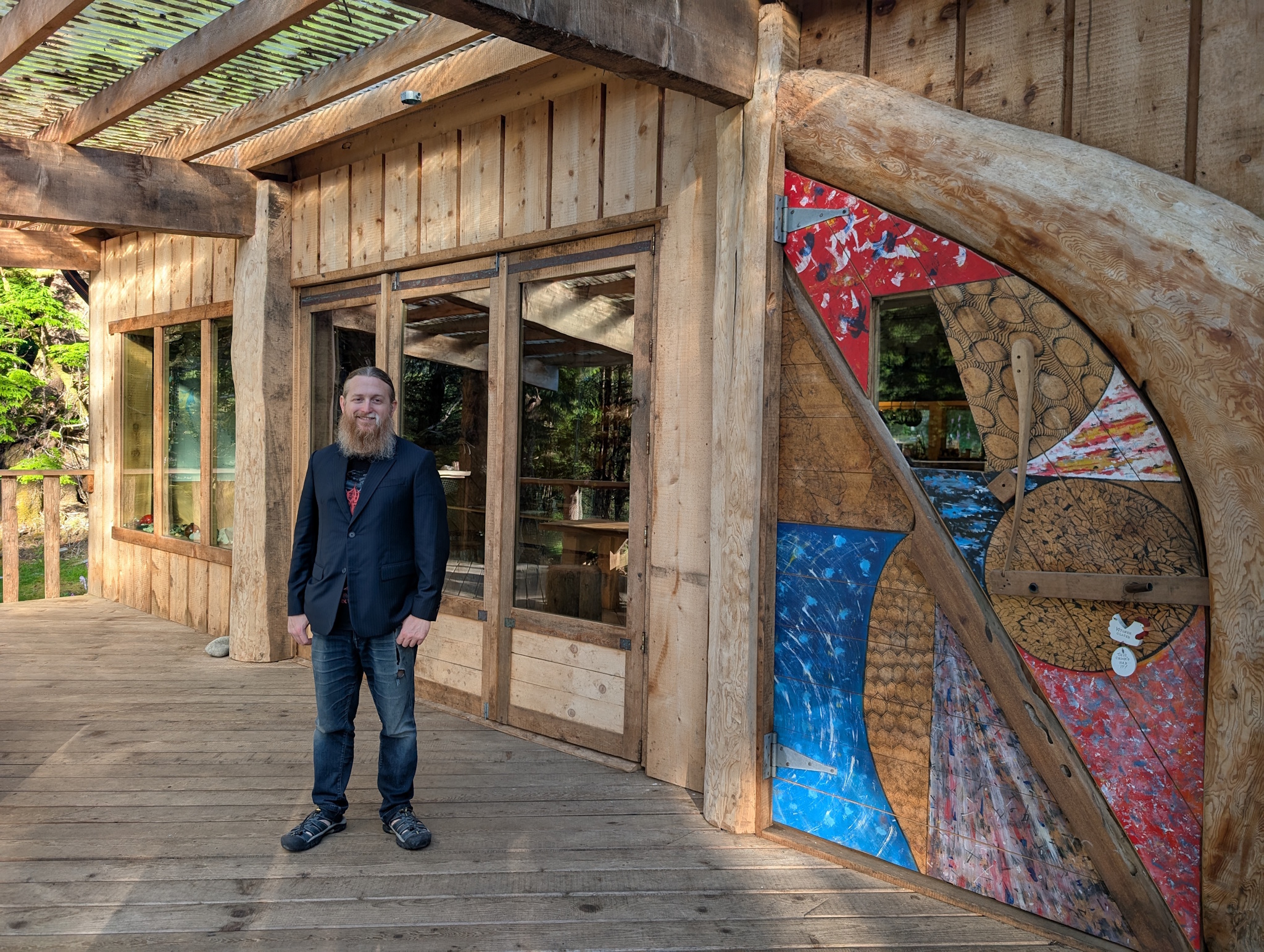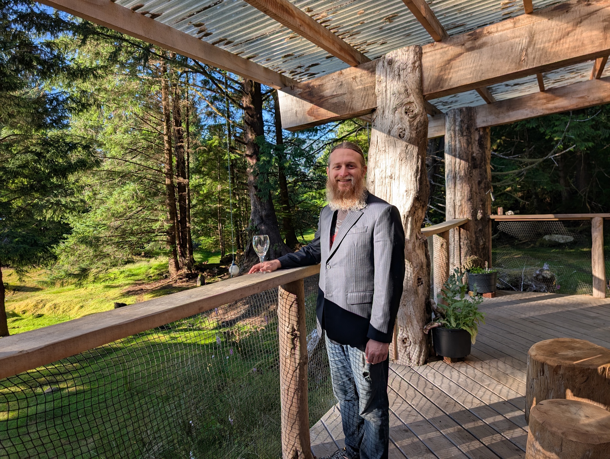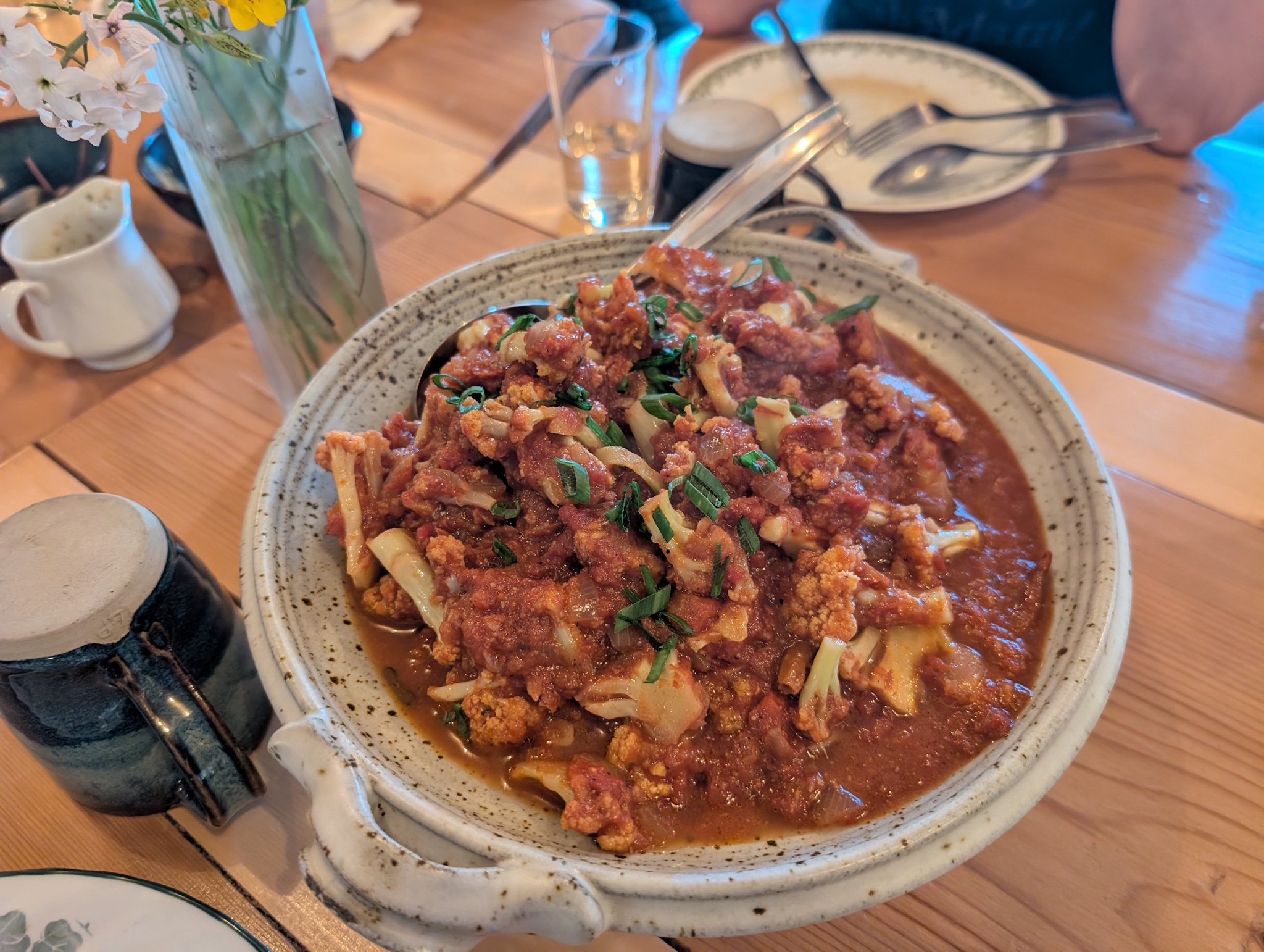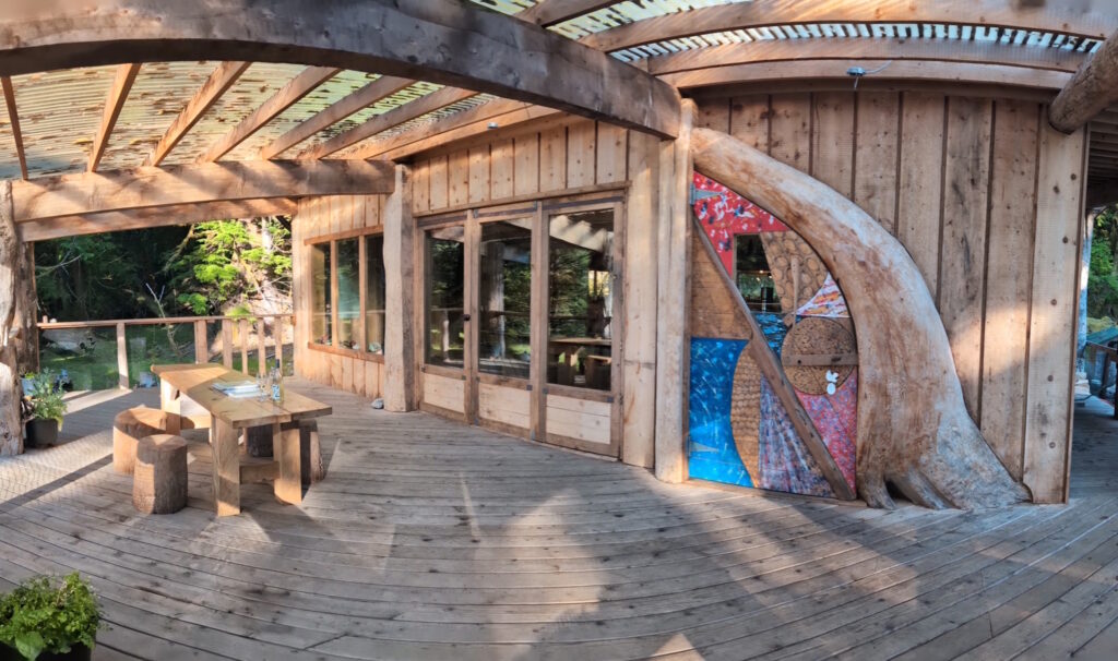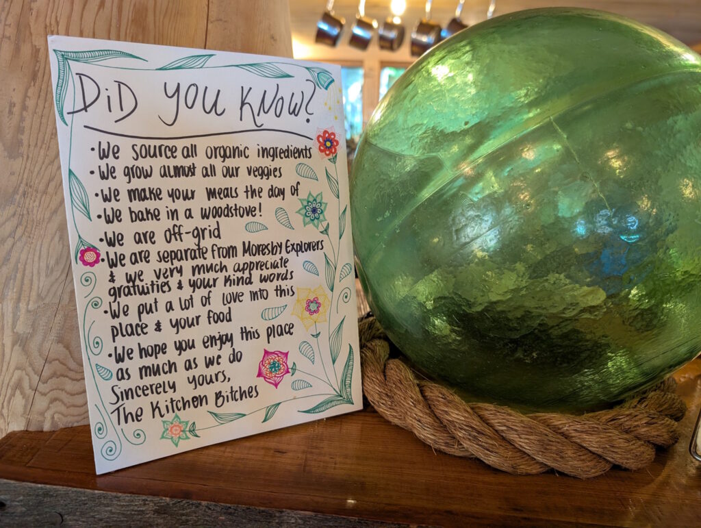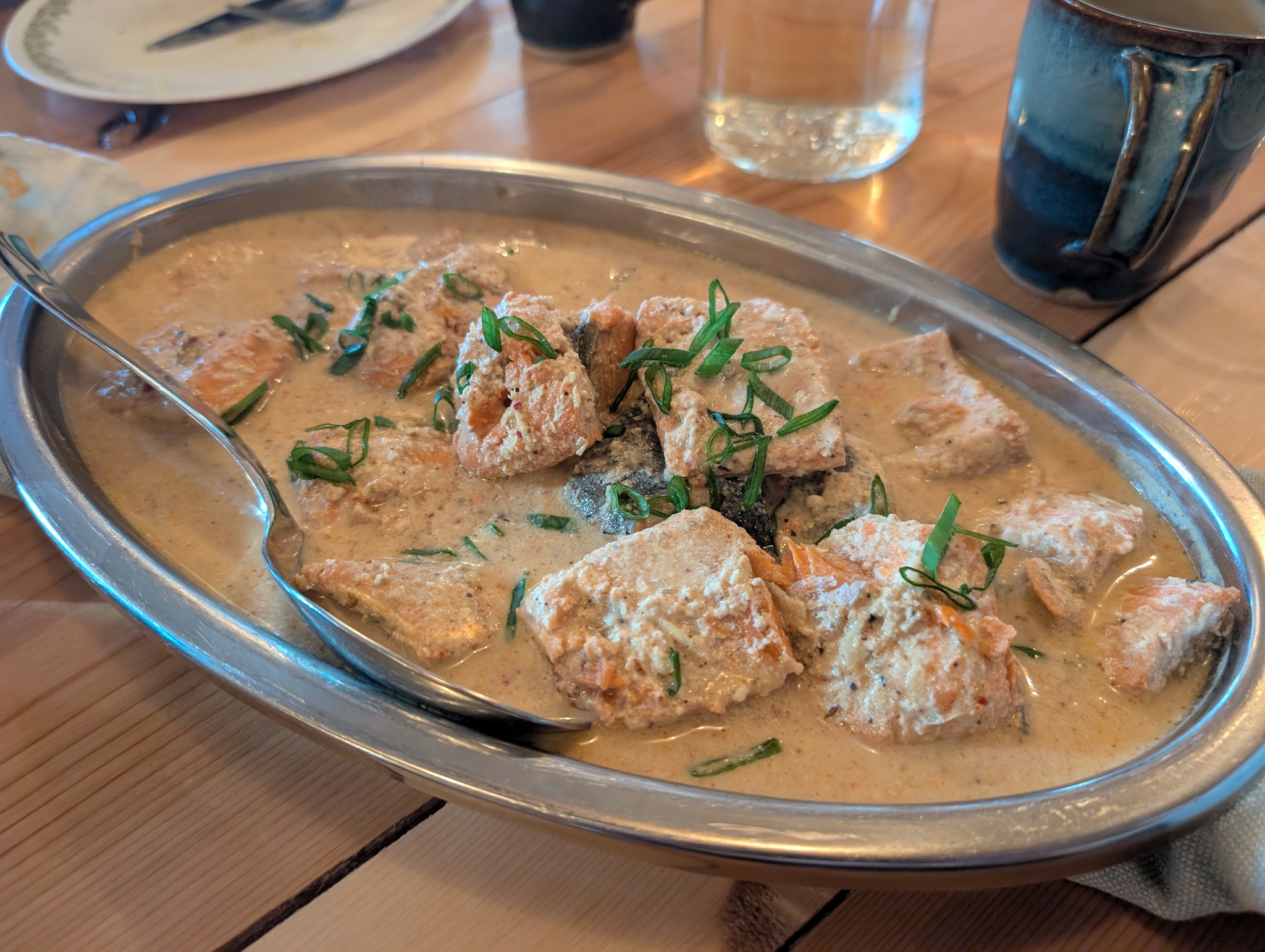 My partner and I arrived a few minutes early for dinner and waited outside on the deck with the bottle of wine we’d brought for ourselves; Rose Harbour Kitchen supplies the food and water, but any other drinks are bring-your-own. The dinner was delightful. Primarily vegetarian, with one course of salmon, the theme of the evening was local ingredients with Indian spices and techniques. We had a fantastic time talking with the other guests about our trip so far, experiences in the Gwaii Haanas, and what they’d seen and would like to see.