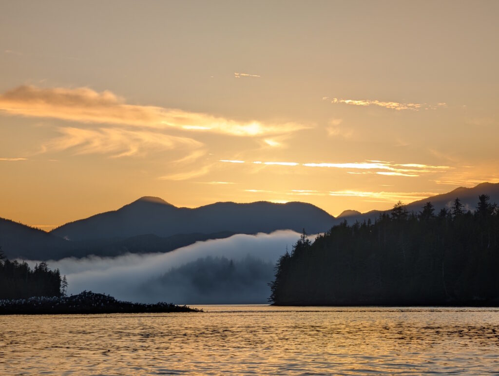 The fog flowing into Rose Inlet continued into the evening past sunset.