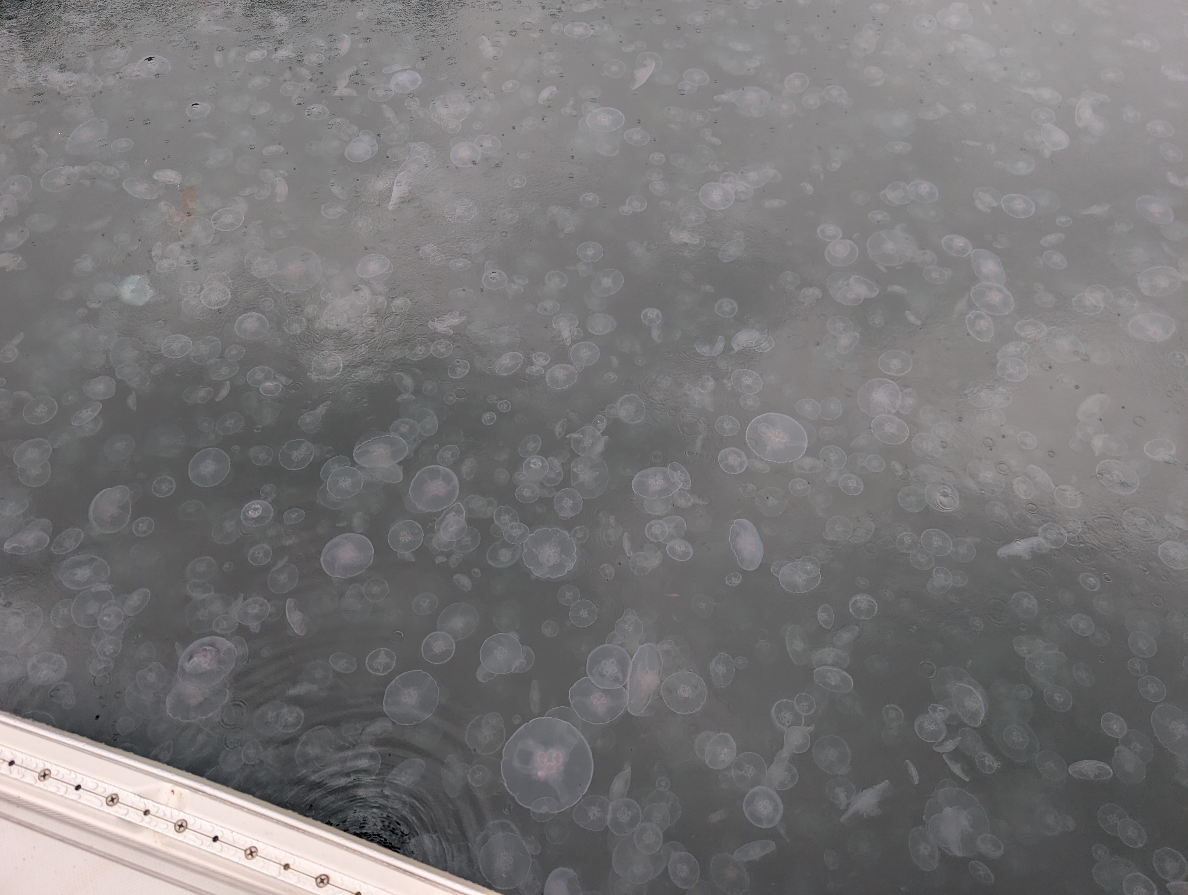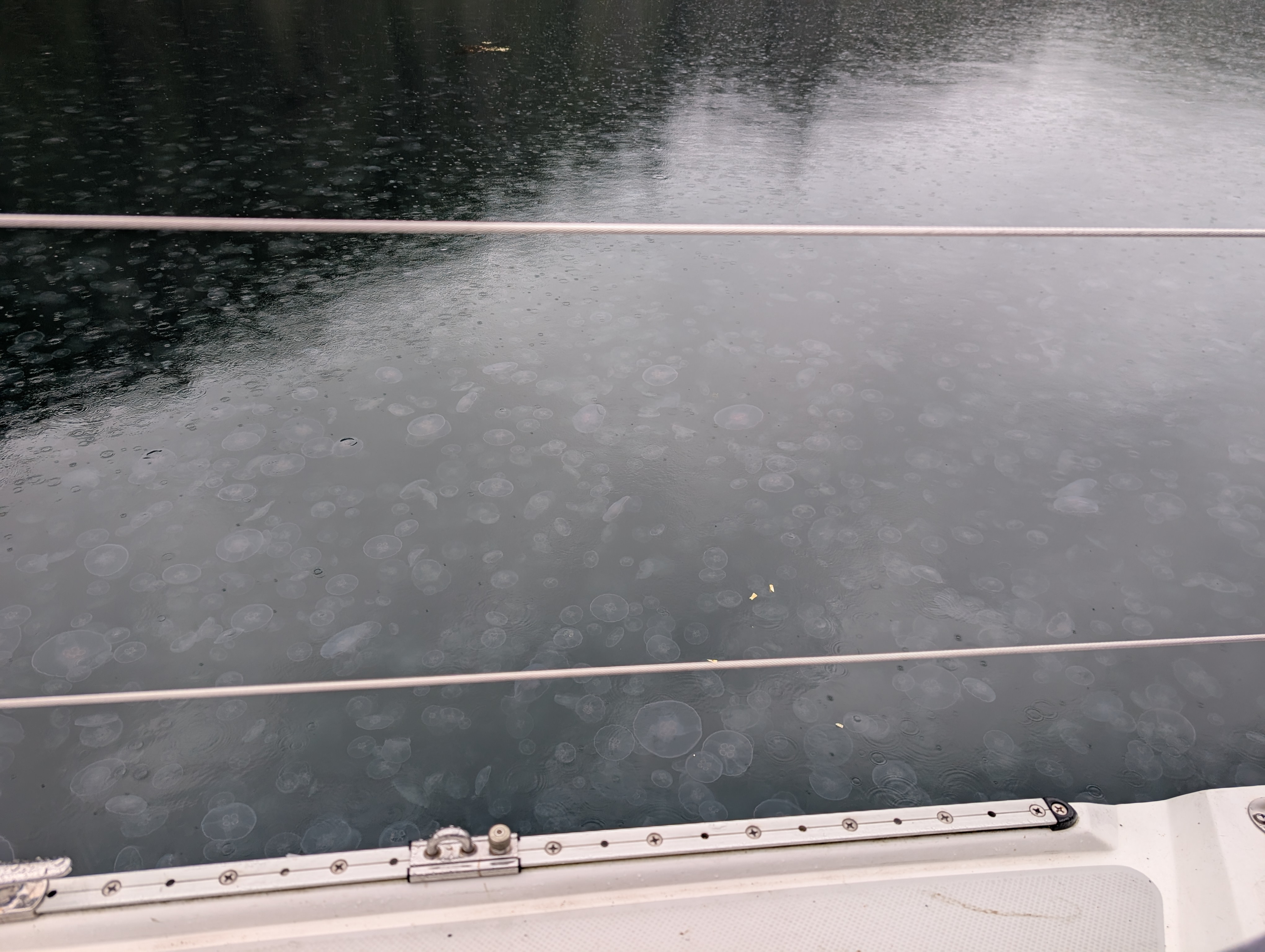 On Monday the 4th we motored out of Winter Harbour and spent several hours trolling for salmon while heading towards Quatsino Sound Provincial Park, anchoring in East Cove in Koprino Harbour (50° 30.0339′ N, 127° 50.4575′ W), surrounded by the densest swarm of moon jellies I’ve ever seen, and sea otters feeding in the shallows northwest of us. While I didn’t have any luck trolling, my partner caught two salmon. One was quite small and we threw it back in immediately, but the other was the biggest fish either of us had caught yet, a 28″ Coho salmon with a huge amount of meat on it, enough for about four meals for us.